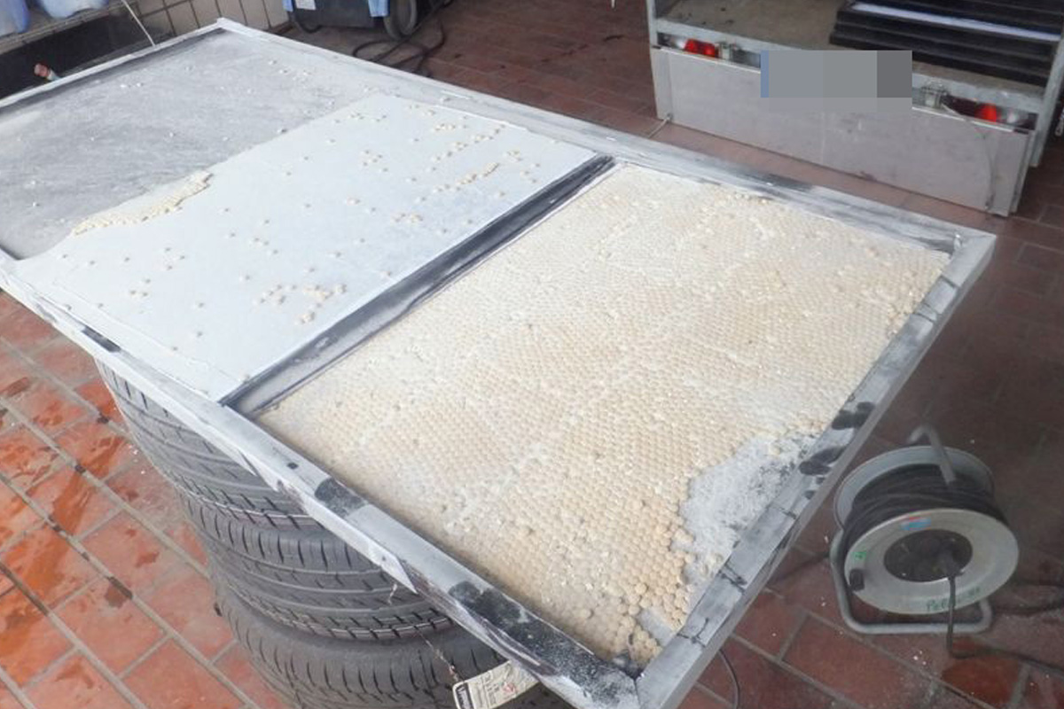 Diensthund Lemmy an einem Stapel großer Kartons an, in denen Solarpaneele gelagert waren. Bei genauerer Untersuchung stellten die Einsatzkräfte fest, dass auf der Rückseite der Paneele durch den 27-jährigen Lebensgefährten der Frau eine Schicht Epoxidharz aufgetragen worden war, in die Aufputsch-Tabletten eingegossen waren.