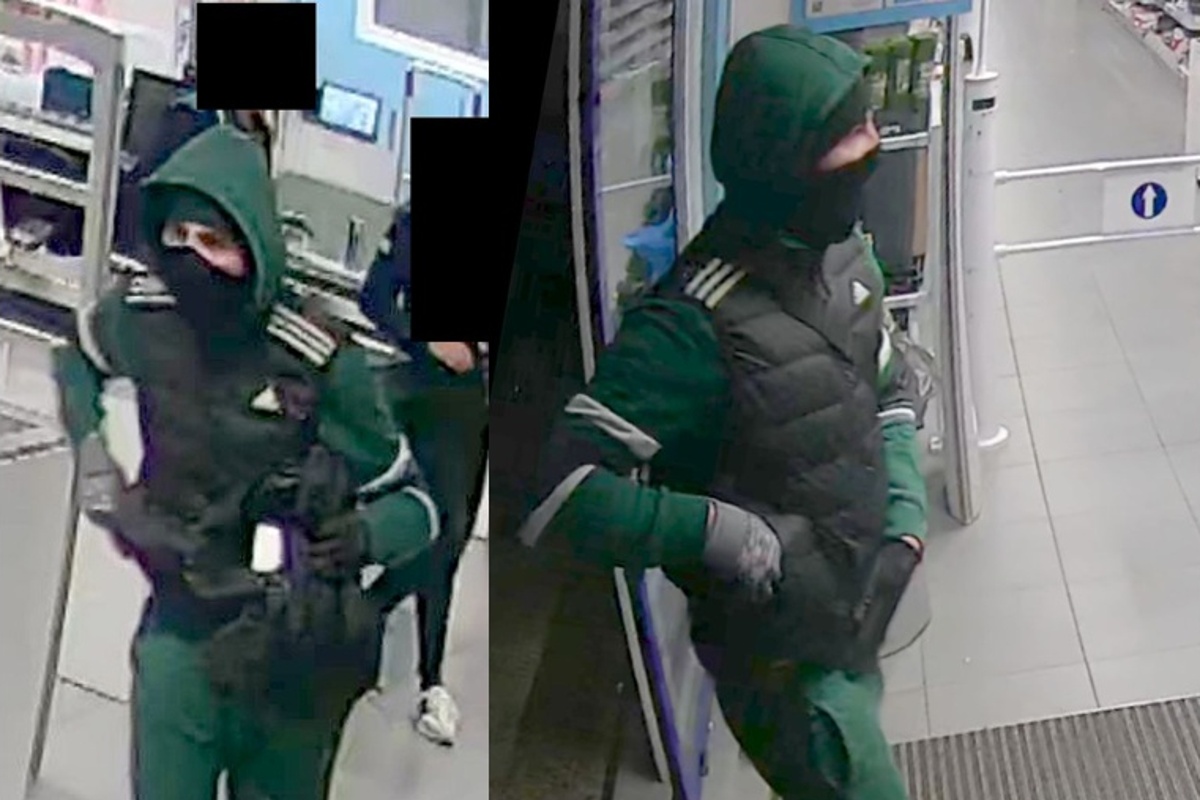 Zum Tatzeitpunkt trug der Täter einen auffälligen, dunkelgrünen Jogginganzug. Außerdem war er mit einer schwarzen Steppweste der Marke Adidas, schwarzen Sneaker und dunklen Handschuhen bekleidet. Er hatte eine schwarze Maske über Mund und Nase gezogen und eine schwarze Sporttasche bei sich. Der Täter sprach mit einem osteuropäischen Akzent.