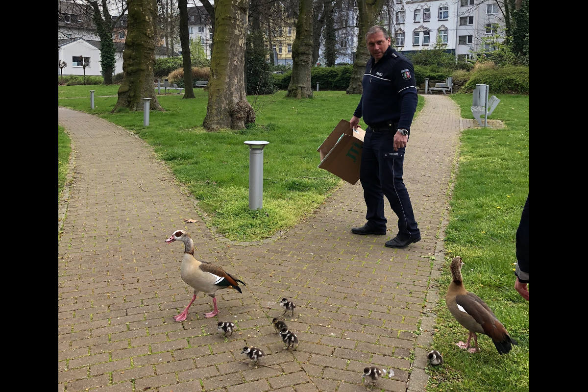Das schöne Ergebnis: Sicher und wohlbehalten konnten die Beamten den Enteneltern und ihrem Nachwusch zum Tagesausflug ins sichere Grüne verhelfen.