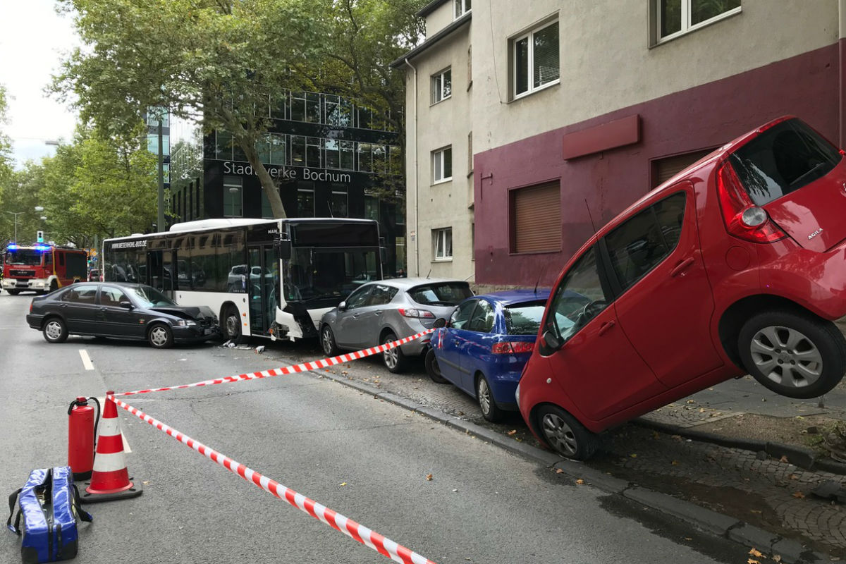 Zu einem ungewöhnlichen Einsatz am Ostring wurde die Feuerwehr Bochum am Montagnachmittag gerufen. Gegen 14:40 Uhr verselbstständigte sich ein am Fahrbahnrand abgestellter Bus eines Essener Busunternehmens und rollte fahrerlos über die Gegenspur gegen einen fahrenden PKW sowie drei parkende Autos, die ineinander und teilweise auf einen Baum geschoben wurden
