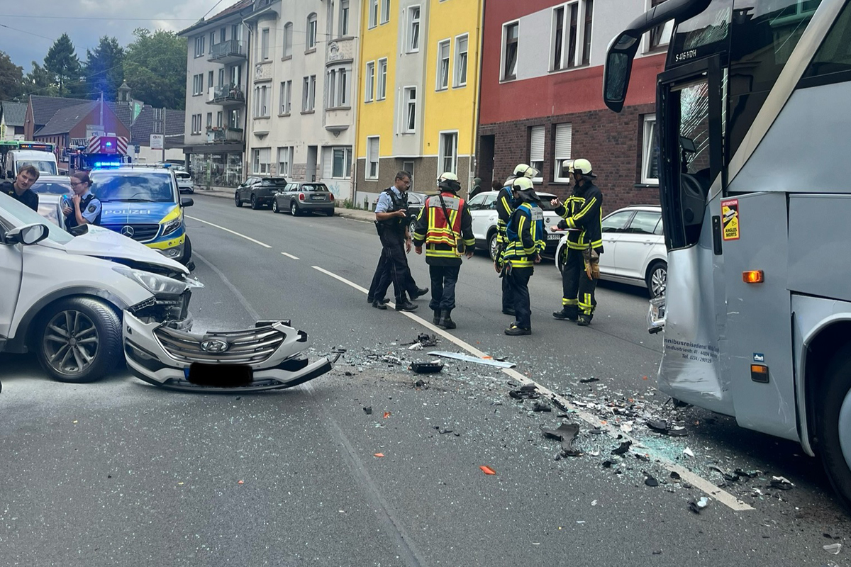 In Bochum-Westenfeld kam es am Samstagmittag (30.08.2025) zu einem Frontalzusammenstoß zwischen einem SUV und einem leeren Reisebus. Fünf Insassen des SUV, darunter vier Kinder, wurden verletzt. Die Polizei ermittelt zur Unfallursache.