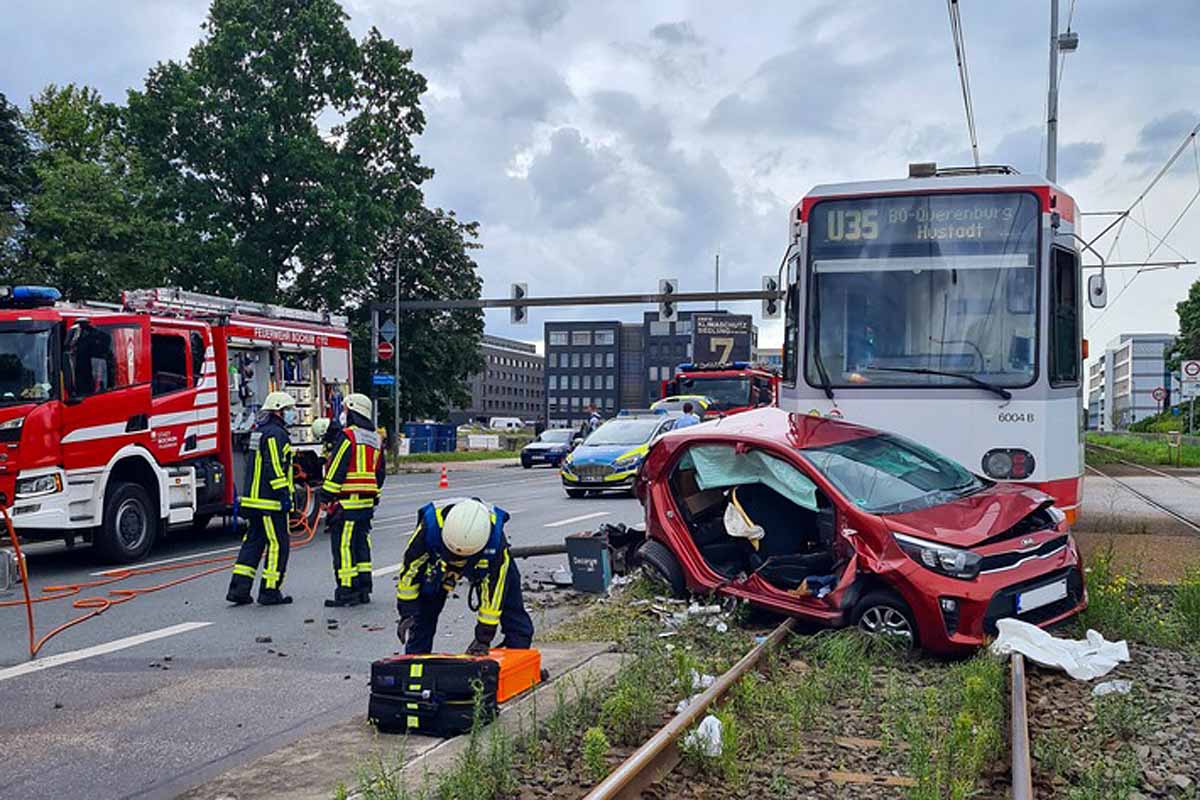 Gestern um 17.40 Uhr erreichten mehrere Anrufe die Leitstelle der Feuerwehr, die einen schweren Verkehrsunfall auf der Universitätsstraße meldeten. In Höhe der A 448 war eine Straßenbahn in Fahrtrichtung Universitätsstraße mit einem Kleinwagen kollidiert.