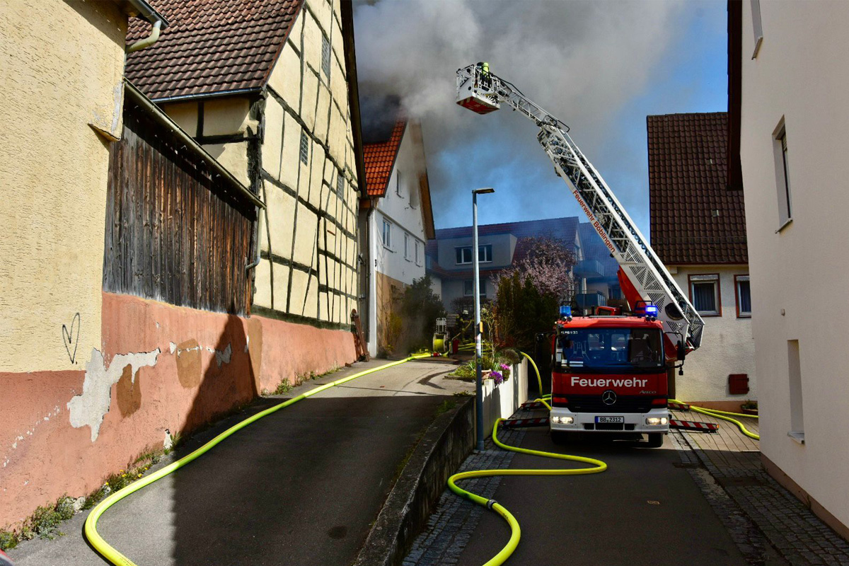 Aufgrund der Brandintensität war bereits bei Eintreffen der ersten Kräfte eine Brandausbreitung in das Wohngebäude, insbesondere in das Dachgeschoss erfolgt. Zu Spitzenzeiten wurden sieben Löschrohre unter anderem im Innenangriff sowie über die Drehleiter eingesetzt.