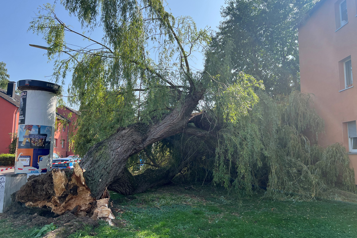 In Bonn ist am Dienstagnachmittag (12.8.2025) ein mehrere Tonnen schwerer Baum neben ein Mehrfamilienhaus gestürzt. Teile des Daches, der Fassade und ein Vordach wurden beschädigt. Verletzt wurde niemand.