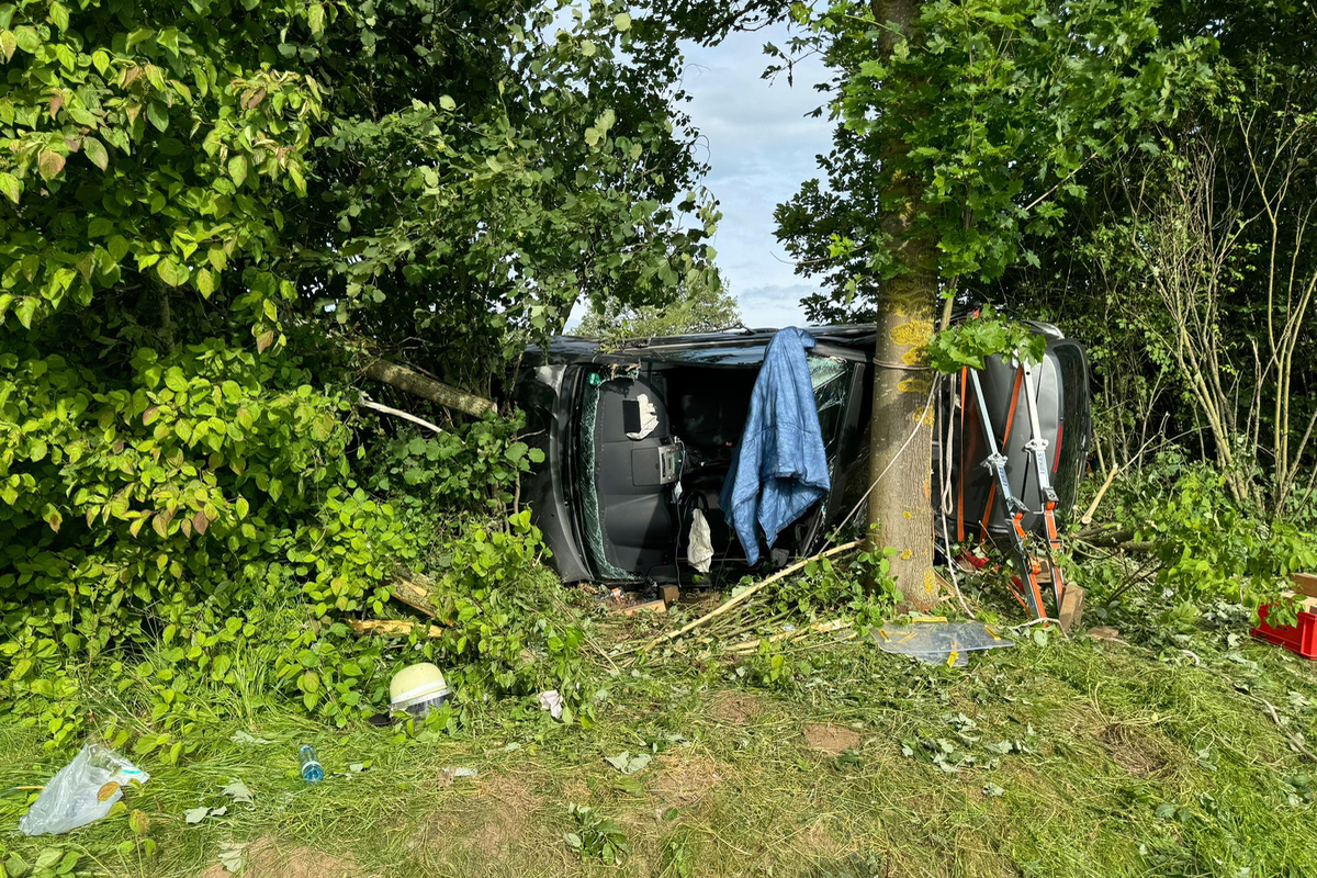 Ein PKW schleuderte nach rechts von der Fahrbahn ab, um blieb auf der Seite zwischen Bäumen im dichten Gestrüpp liegen.
