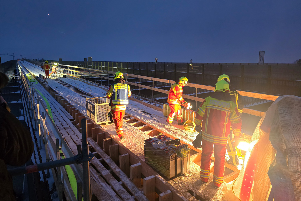 Am Dienstag, 17.02.2026, geriet auf dem Ersatzbauwerk der Rader Hochbrücke bei Borgstedt eine Acetylenflasche in Brand. Wegen akuter Explosionsgefahr wurde ein 200-Meter-Sicherheitsradius eingerichtet, die A7 in beide Richtungen sowie der Schiffsverkehr auf dem Nord-Ostsee-Kanal gesperrt.