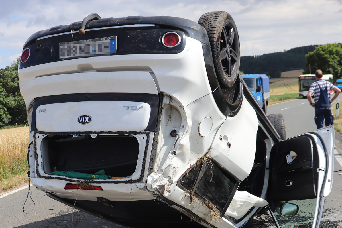 Das Fahrzeug durchfuhr den Straßengraben, überschlug sich und kam schließlich auf dem Dach liegend auf der Fahrbahn zum Stillstand.