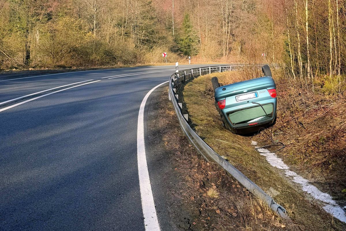 Auf der B4 bei Braunlage (NI) hat ein 26-jähriger Autofahrer am 05.03.2026 wegen Straßenglätte die Kontrolle über seinen Wagen verloren. Das Fahrzeug überschlug sich und landete auf dem Dach. Beide Insassen blieben unverletzt.