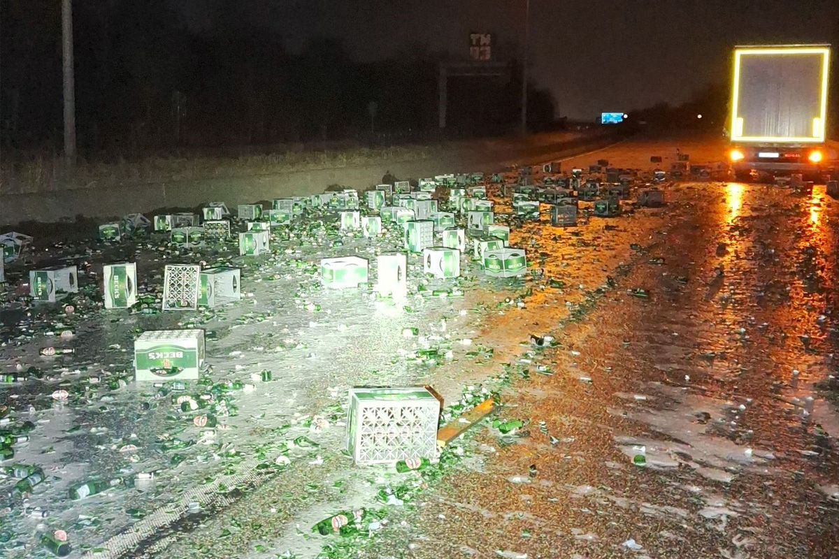 In der Nacht zum 04.03.2026 verlor ein Lkw auf der A281 in Bremen rund 100 Kisten Bier. Die Ladung durchbrach die Plane des Aufliegers und verteilte sich auf der Fahrbahn. Die Autobahn musste für Aufräumarbeiten gesperrt werden.
