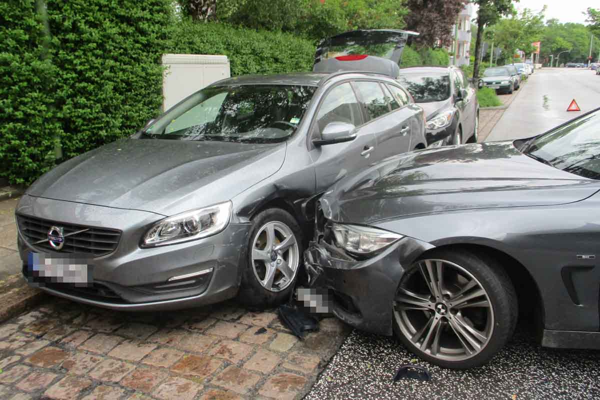 Trotz des Versuches gegenzulenken kollidierte der BMW mit einem Volvo, der in einer Parkbucht auf der entgegengesetzten Straßenseite geparkt war.