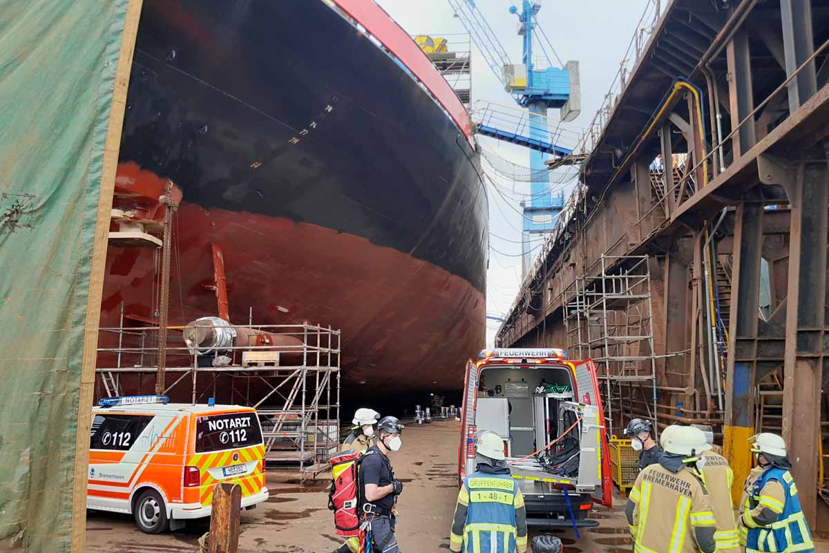 Die Höhenrettungsgruppe der Berufsfeuerwehr befand sich auf dem Rückweg von einem Einsatz in Beverstedt, als der der Integrierten Regionalleitstelle Unterweser-Elbe eine abgestürzte Person in einem Trockendock der Bredowerft im Fischereihafen gemeldet wurde.