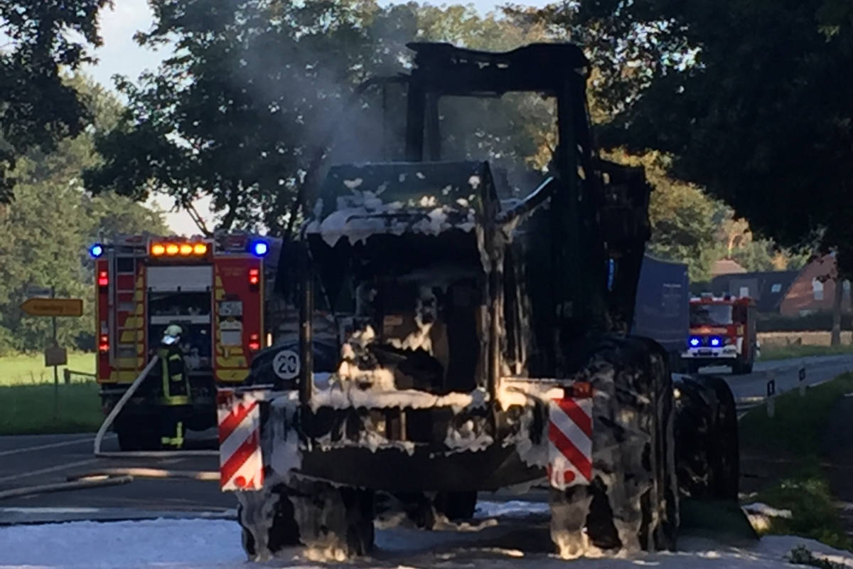 Aufgrund eines brennenden Harvester rückte heute morgen um 08.00 Uhr die Feuerwehr Hünxe aus.