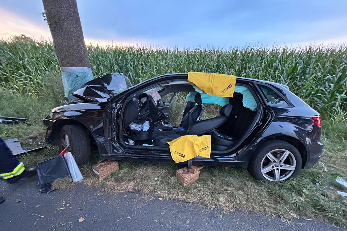 Am Dienstagabend (26.08.2025) kam in Brest ein 18-jähriger Autofahrer mit seinem Audi von der Straße ab und prallte frontal gegen einen Baum. Er wurde im Fahrzeug eingeklemmt und schwer verletzt.