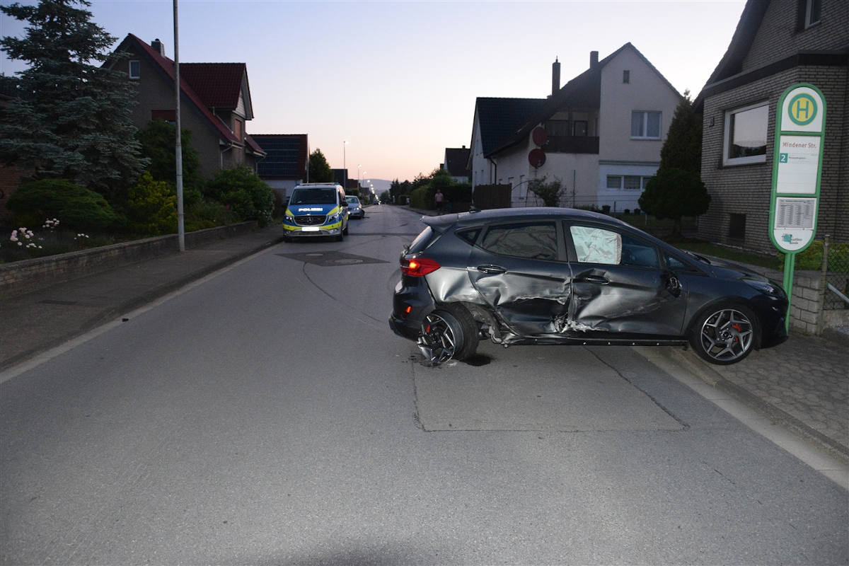 Was sie auf der Straße sahen, waren zwei beschädigte Autos: Ein 23-jähriger Bünder fuhr mit seinem Ford in Richtung Mindener Straße und auf Höhe der Hausnummer 112 fuhr er in einen am Fahrbahnrand geparkten Mercedes. Nach dem starken Aufprall kam der Ford ein paar Meter weiter auf der Gegenfahrbahn zum Stehen. Der 23-jährige Fahrer konnte sein Fahrzeug eigenständig verlassen.