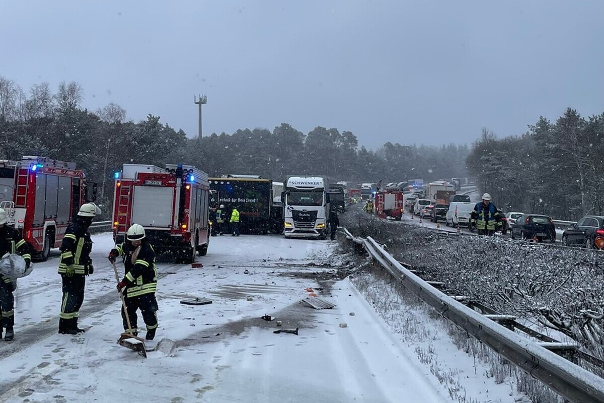 Insgesamt zählte die Polizei 18 an Unfällen beteiligte Fahrzeuge und zwei verletzte Verkehrsteilnehmer. Der Gesamtschaden wird auf mehrere 100.000 Euro geschätzt.