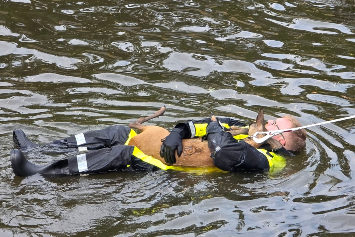 Er sicherte das Tier, so dass beide ans Ufer gezogen werden konnten. Hier floh das Reh offensichtlich unverletzt in die angrenzende Vegetation.