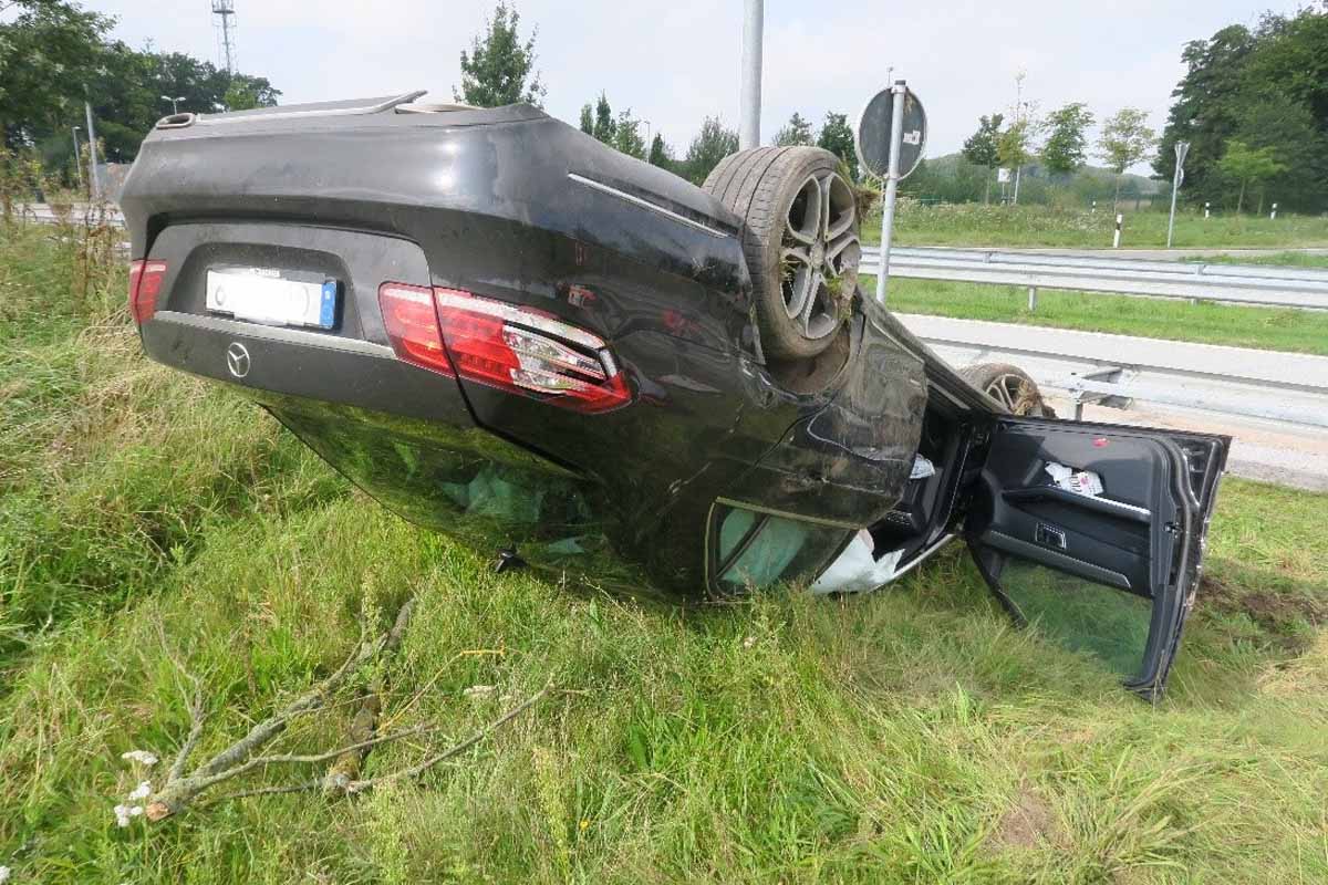 Der Pkw überschlug sich in der Folge mehrfach und landete schließlich zwischen der Autobahn und dem Parkplatz im Grünbereich auf dem Fahrzeugdach.