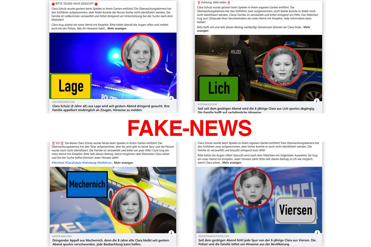 Beispiele der Falschnachrichten über die Entführung der 8-jährigen Clara. (Bildquelle: Redaktion Polizeiticker Deutschland)