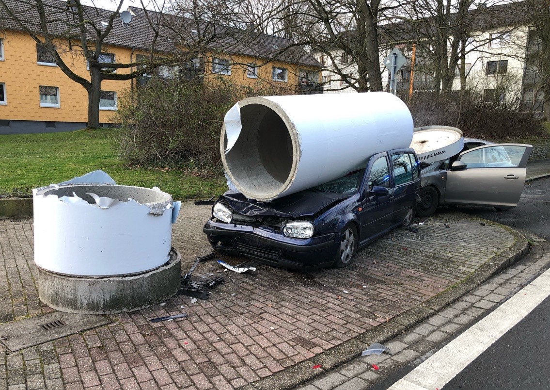 Durch die Wucht wurde der Golf gegen eine Litfaßsäule geschoben. Diese zerfiel in drei Teile. Der Sockel wurde vom Fundament gedrückt, das Mittelstück kippte auf den Golf und drückte das Dach und die Motorhaube ein. Der Säulendeckel schlug auf Motorhaube, Windschutzscheibe und das Dach des Opels auf.