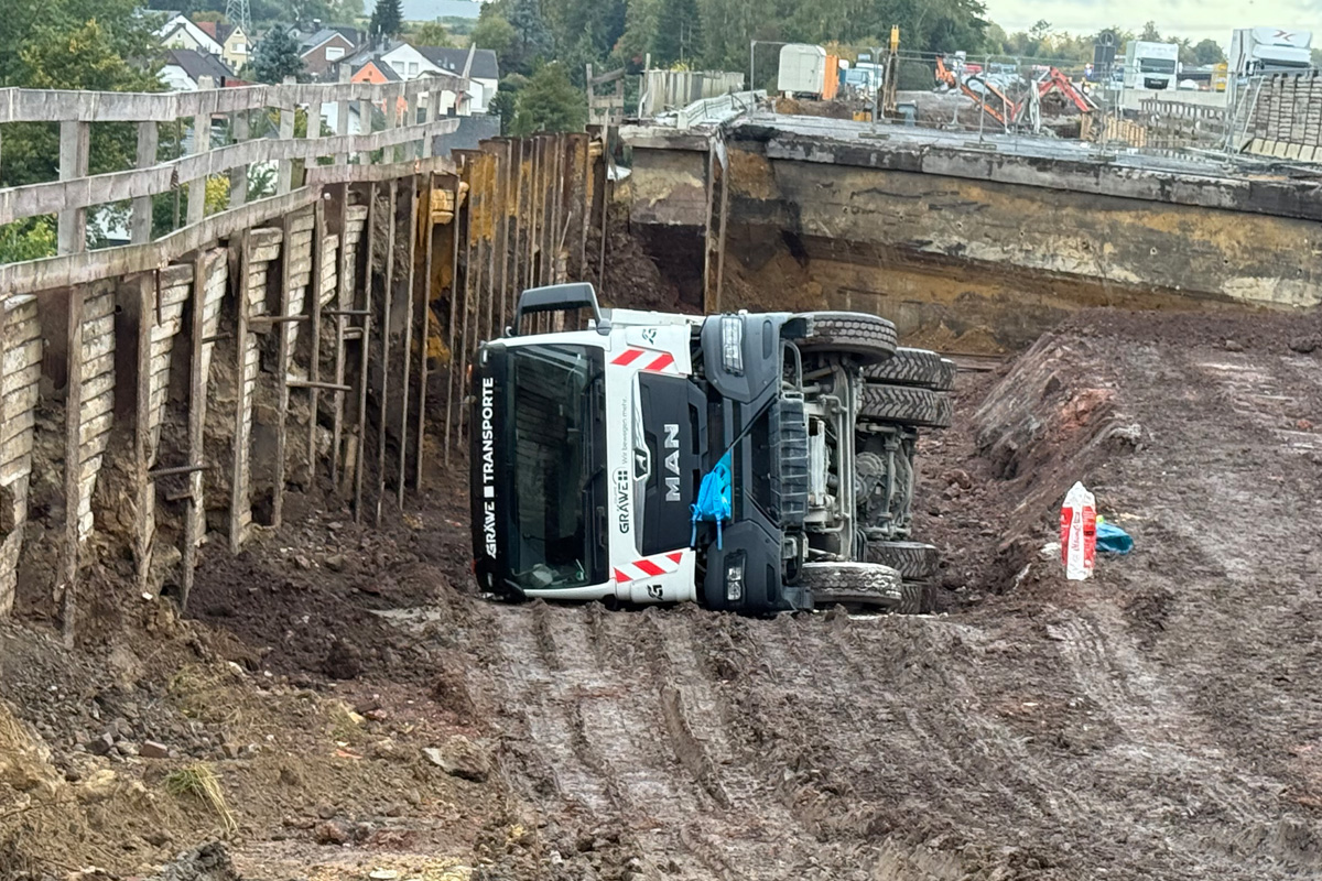 Nach ersten Notrufen war in einer Baustelle ein Lastkraftwagen umgestürzt, wobei sich mindestens eine Person noch im Fahrzeug befinden sollte.