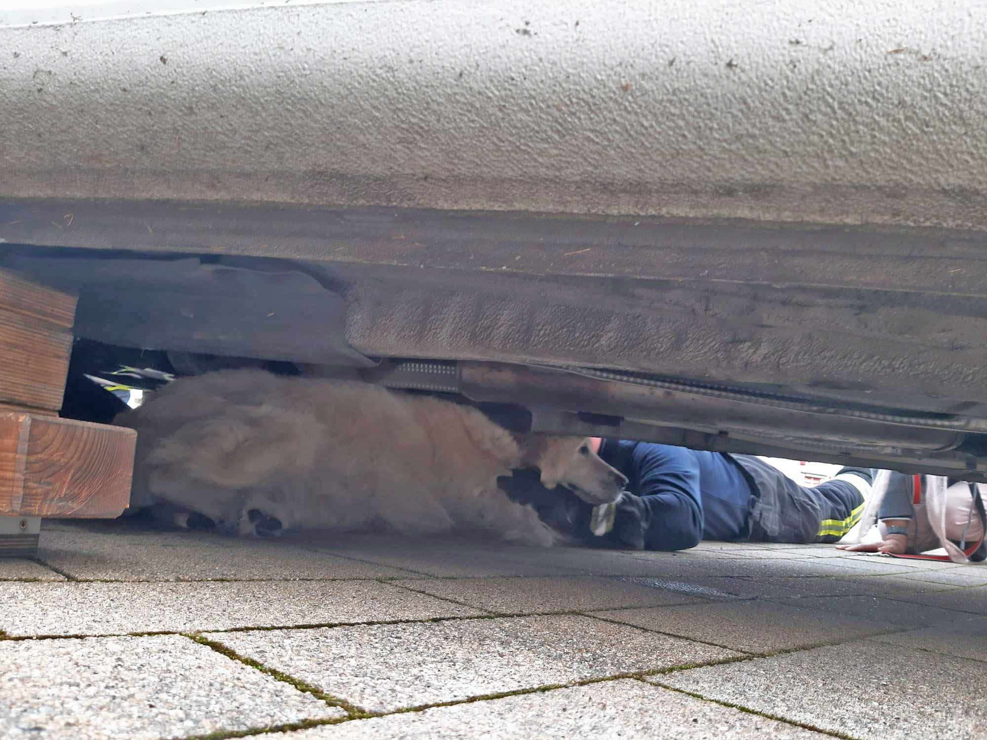 Die gerufenen Brandschützer hoben den Wagen mit speziellen Luftkissen an. So konnte der Hund schonend aus seiner misslichen Lage befreit werden. Eine Verletzung war offensichtlich nicht zu erkennen, dennoch brachte seine Besitzerin ihn zur weiteren Abklärung zu einem Tierarzt.