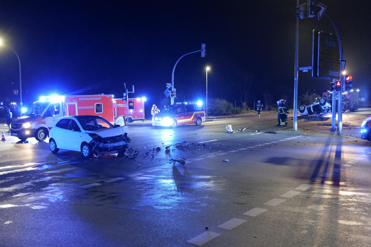 Ein Auto wurde bei der Kollision aufs Dach geschleudert. (Bildquelle: Feuerwehr Dortmund)
