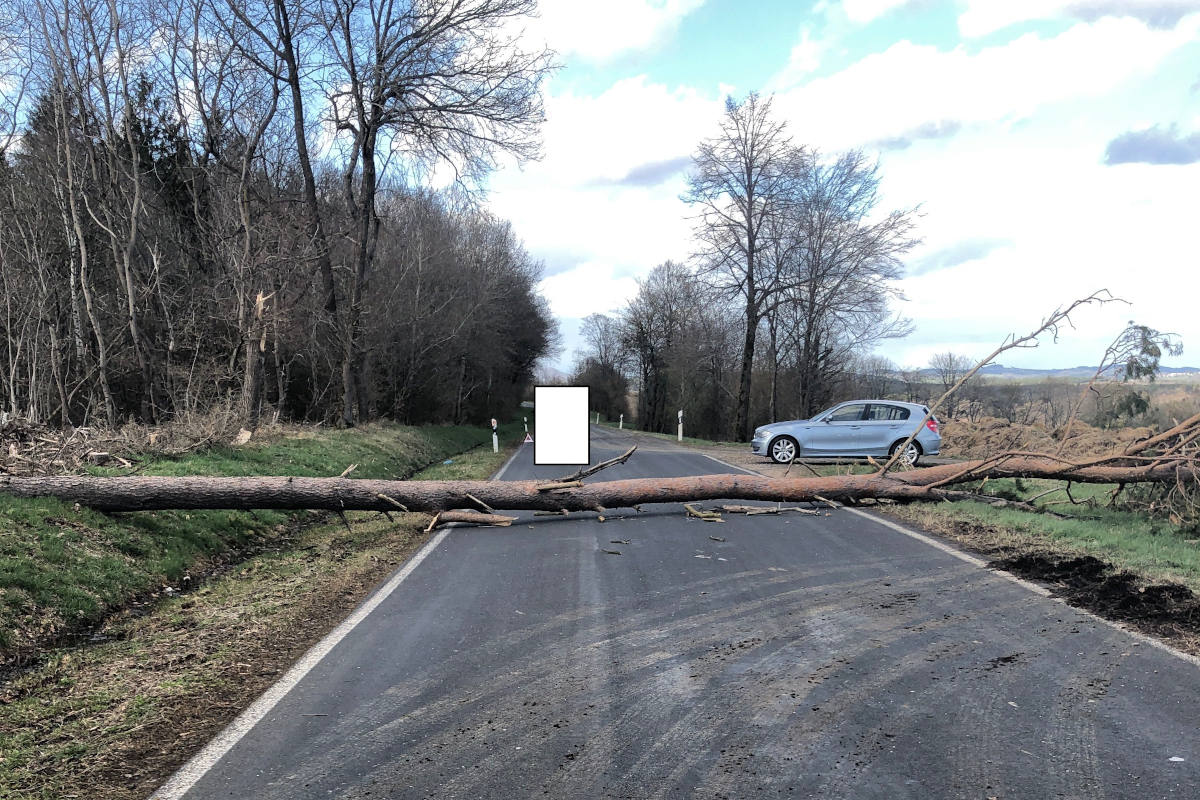 Aufgrund des starken Sturms wurde eine unmittelbar am Fahrbahnrand stehende ca. 20 m hohe Kiefer entwurzelt und stürzte auf die Kreisstraße. Zu der Zeit passierte der Fahrzeugführer die stürzende Kiefer. Ein herabfallender Ast durchschlug die Windschutzscheibe und beschädigte das Fahrzeugdach, unmittelbar hinter dem Fahrzeug schlug die Kiefer auf der Fahrbahn auf.