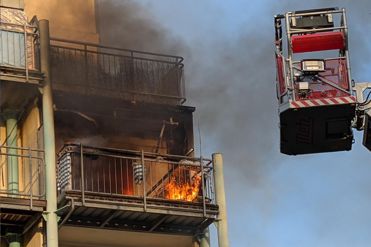 Aus noch ungeklärter Ursache war in einer Wohnung im 4. Obergeschoss ein Brand ausgebrochen, der sich rasch ausbreitete. Bereits auf der Anfahrt erkannten die Einsatzkräfte dichten Brandrauch, der aus nahezu allen Öffnungen der Wohnung auf beiden Gebäudeseiten drang.