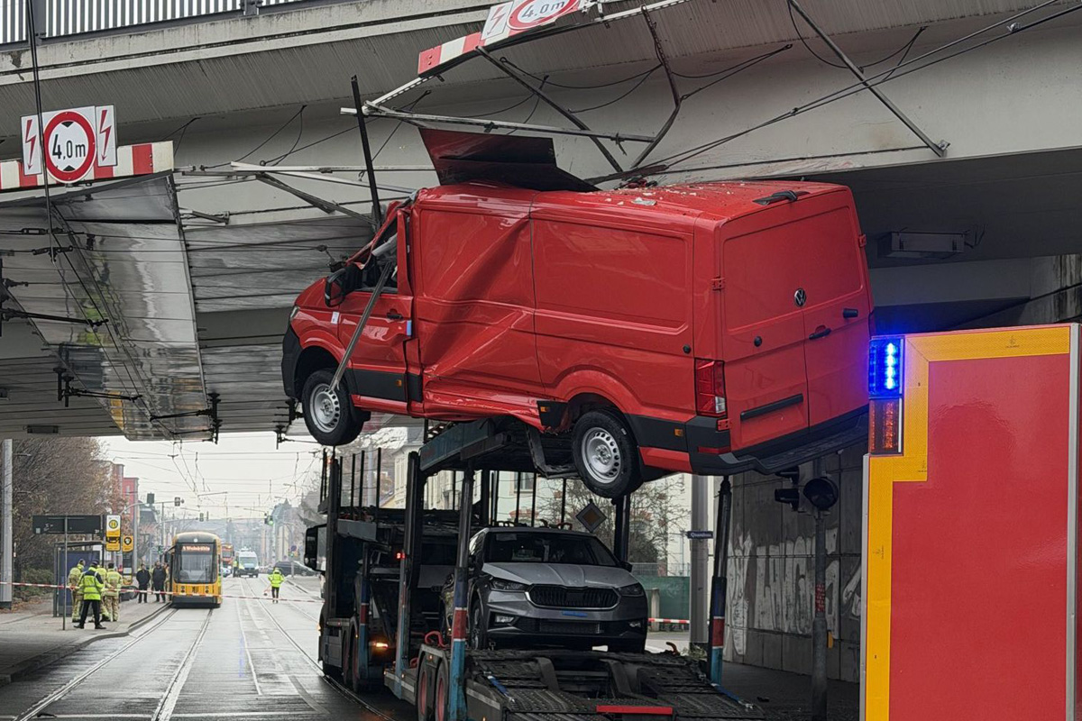 Am Samstagmittag, 29.11.2025, blieb ein Fahrzeugtransporter auf der Leipziger Straße in Dresden unter einer Brücke stecken. Ein geladener Kleintransporter drohte abzustürzen, außerdem wurde die Oberleitung der Straßenbahn beschädigt. Die Feuerwehr sicherte die Lage aufwendig mit Spezialgerät.