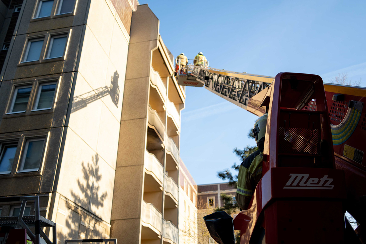 Beim Eintreffen der ersten Einsatzkräfte drang Rauch aus einem geöffneten Fenster einer Wohnung im zweiten Obergeschoss eines Plattenbaus.