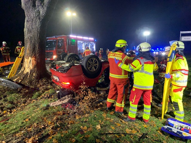 Fahrer nach Überschlag im Fahrzeug eingeklemmt und schwer verletzt (Bildquelle: Feuerwehr Düren)