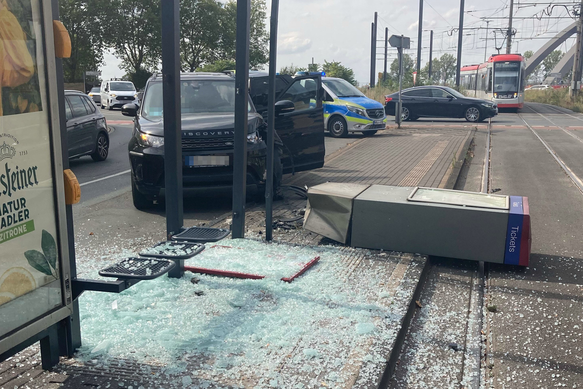 Am 27.08.2025, gegen 15:30 Uhr, ist eine 54 Jahre alte Frau mit ihrem Land Rover auf der Ruhrorter Straße von der Fahrbahn abgekommen und in die Straßenbahnhaltestelle „Albertstraße“ gefahren.
