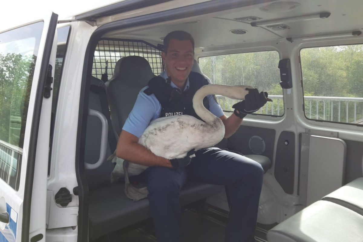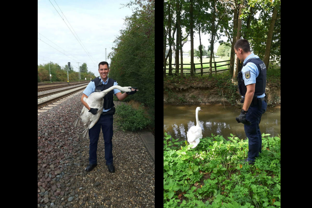 Eine Streife der Bundespolizeiinspektion Düsseldorf konnte nach kurzzeitiger Gleissperrung und Nacheile einen Schwan aus dem Gleisbereich retten und in Sicherheit bringen. Der Gerettete war seinem Freund und Helfer Polizeimeister Daniel T. sichtlich dankbar.