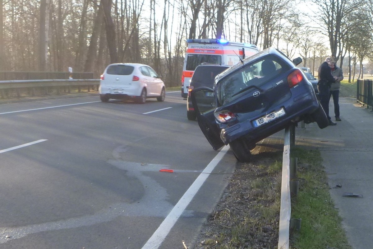 Ein entgegenkommender Pkw Toyota Yaris eines 22-Jährige musste dabei gegen 16:30 Uhr stark abbremsen, um eine Kollision zu verhindern. Ein dahinterfahrenden Pkw VW fuhr auf den Toyota auf und schob diesen in eine Leitplanke.