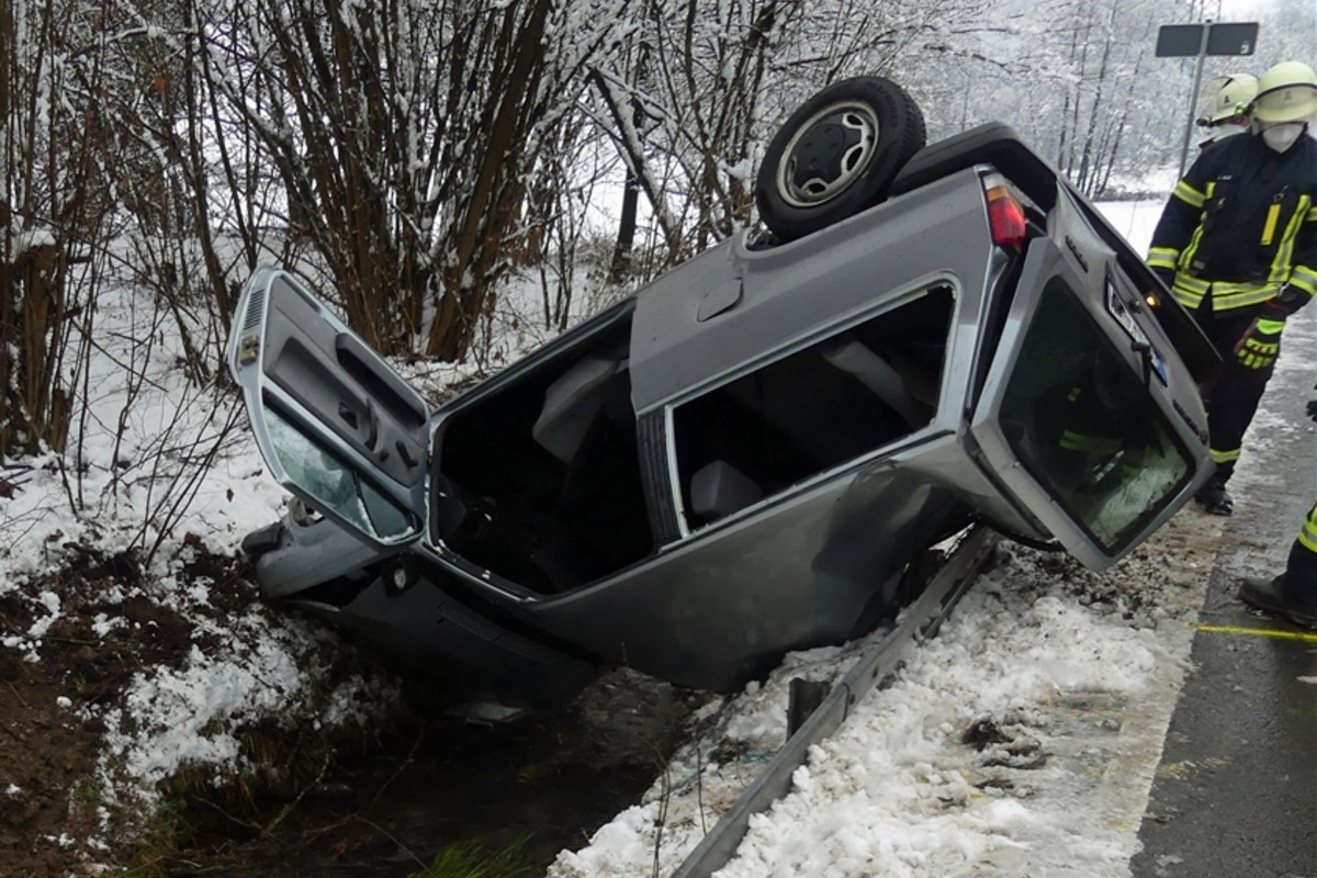 Dieser kam nach links von der Fahrbahn ab, überschlug sich im dortigen Graben und kam auf dem Dach liegend zum Stillstand. Der Fahrer konnte sich selbst aus dem Auto befreien und kam mit leichten Verletzungen in ein Krankenhaus.