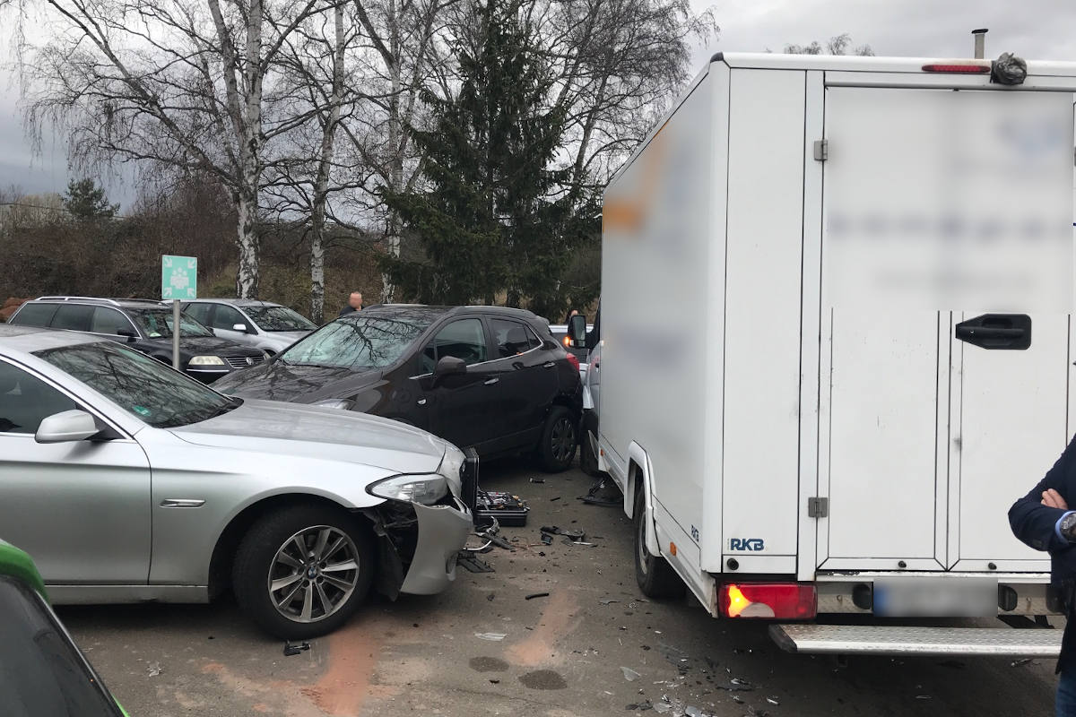Eine Kettenreaktion löste am Freitagmittag ein Unfall in der Donnersbergstraße aus. Am Ende waren sieben Fahrzeuge und ein Werbeschild beschädigt. Der Sachschaden dürfte deutlich über 100.000 Euro liegen. Der 37-jährige Unfallverursacher hatte sich verschluckt. Er kam vorsorglich ins Krankenhaus.
