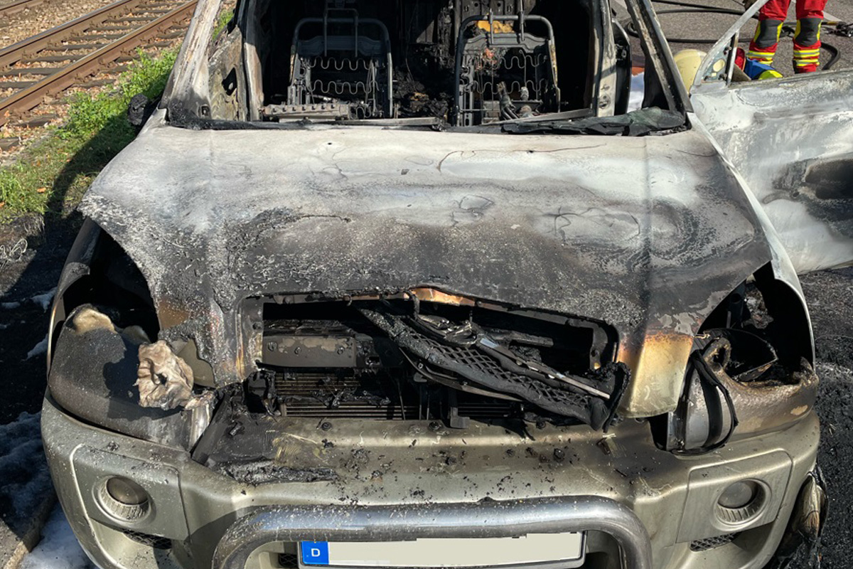Am Donnerstagmittag (02.10.2025) fing ein Hyundai SUV in der Binderslebener Landstraße in Erfurt vermutlich wegen eines technischen Defekts Feuer. Das Fahrzeug brannte vollständig aus, der Fahrer wurde wegen eingeatmetem Rauch ins Krankenhaus gebracht.