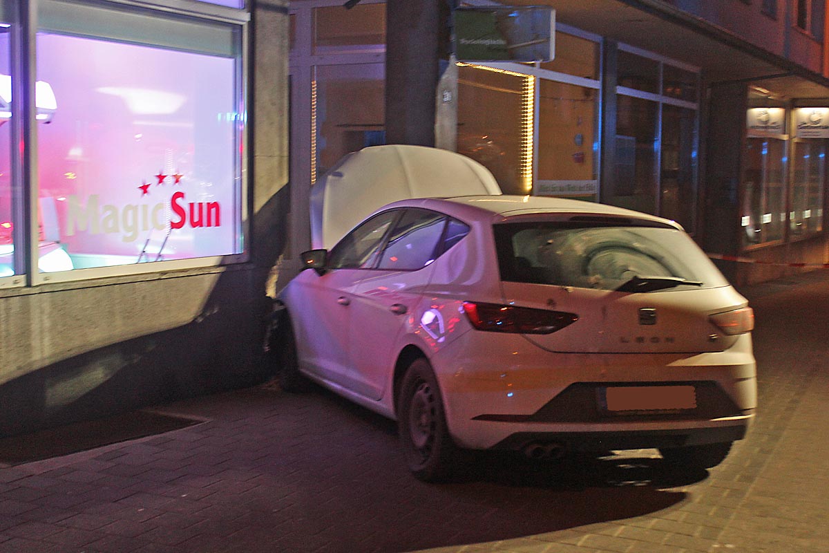 Der Seat kam gestern nach links von der Fahrbahn ab und prallte mit großer Wucht in die Fassade des Hauses Nr. 37 und den Eingangsbereich des Hauses Nr. 39. Hierbei verletzte sich der Autofahrer leicht und es entstand ein geschätzter Gesamtsachschaden in Höhe von mindestens 13.000,- Euro am Haus und am nicht mehr fahrbereiten Seat.