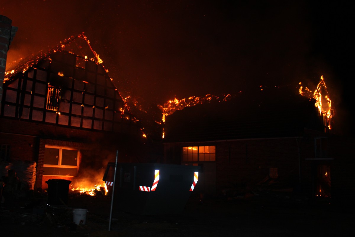 Den ersten Ermittlungen zufolge hatte ein Anwohner gegen 0.30 Uhr einen lauten Knall gehört und bei einem Blick aus dem Fenster das in Vollbrand stehende Bauernhaus bemerkt. Kräften der alarmierten Feuerwehr gelang es, die Flammen unter Kontrolle zu bringen. Dennoch konnte das Gebäude nicht mehr gerettet werden.