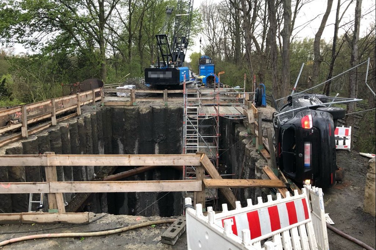 Die Polizisten verloren kurzzeitig den Sichtkontakt zu dem VW und fuhren die Dellwiger Straße weiter in Richtung der Oberhausener Stadtgrenze. Im Einmündungsbereich der Dellwiger Straße / Ripshorster Straße stellte der Streifenwagen den verunfallten Pkw in einer Baustelle fest. Das Auto lag auf der linken Fahrzeugseite und blieb nur wenige Zentimeter vor dem Rand einer 16 Meter tiefen Baustellegrube liegen.