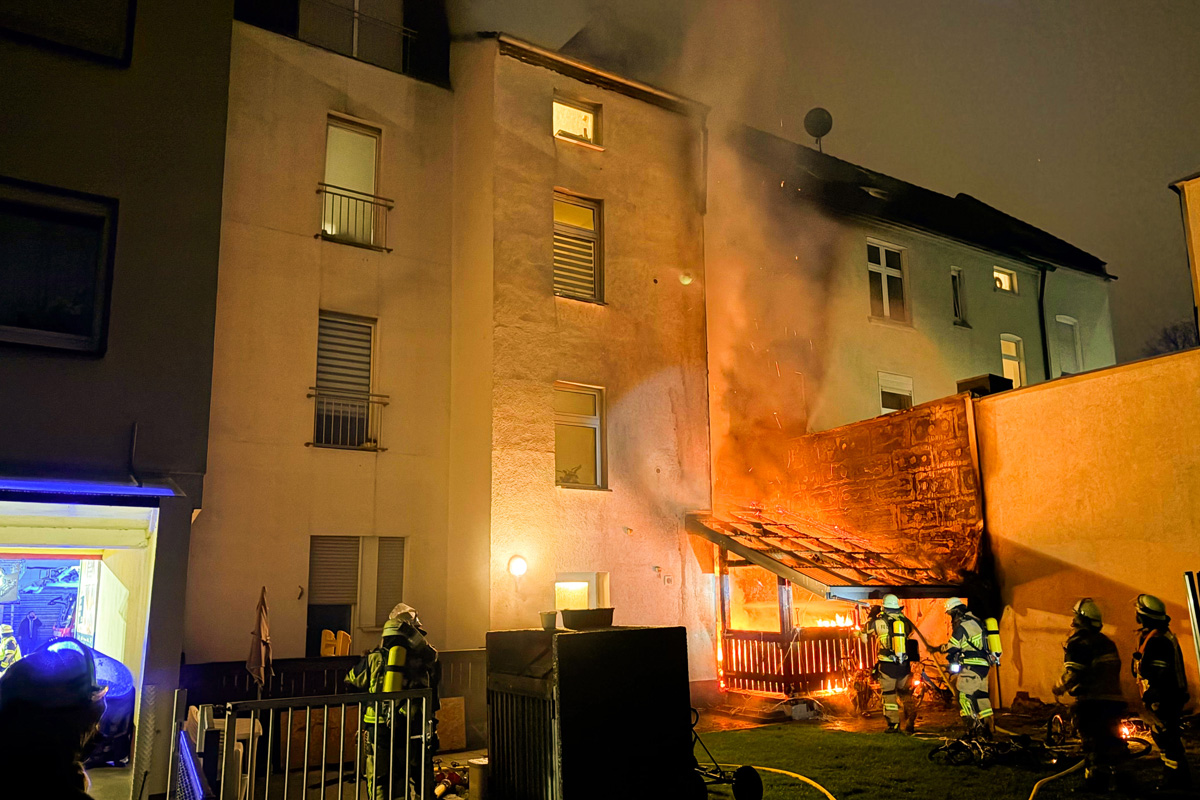 Beim Eintreffen der ersten Rettungskräfte bestätigte sich die Lage: Die Fassade des Anbaus stand auf größerer Fläche in Brand und die Flammen hatten sich bereits bis unter die Dachrinne des Mehrfamilienhauses ausgebreitet.