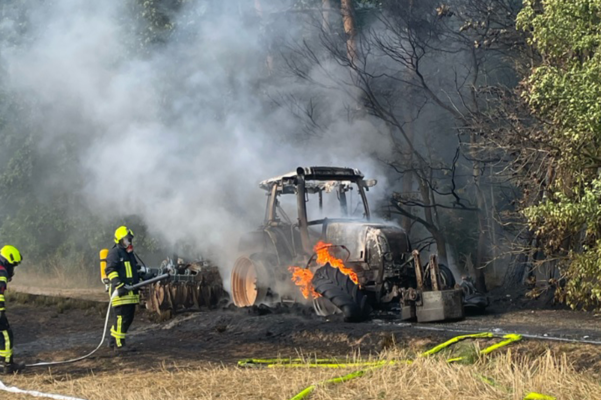 Das Fahrzeug samt angehängter Scheibenegge brannte vollständig ab. Da sich der Brand an einem Feldrand ereignete, in unmittelbarer Nähe zu einem Wald, griff das Feuer auf umliegende Bäume über.