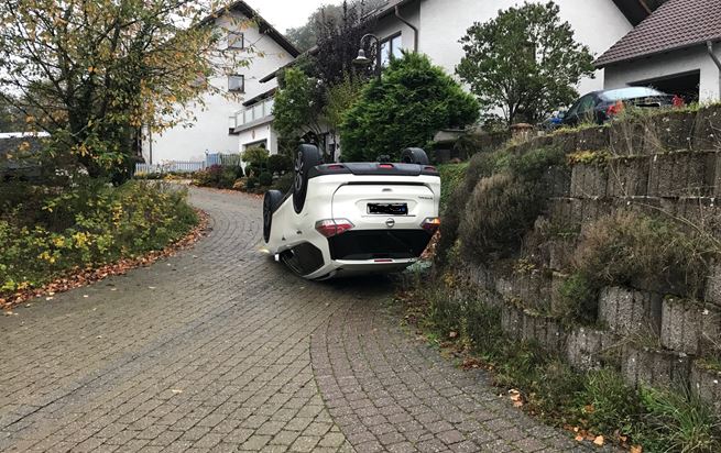 Der 58-Jährige war am Donnerstag, den 17.10.2019, gegen 08:00 Uhr, in Eulenbis unterwegs. Auf Grund seiner fehlenden Ortskenntnis fuhr er in die erhöhte Zufahrt eines Grundstückes ein. Hier übersah er, dass die Zufahrt mit dem Absatz endete. Trotz seiner geringen Geschwindigkeit, konnte er nicht mehr rechtzeitig bremsen und sein Fahrzeug kippte den Absatz hinunter und blieb auf dem Dach liegen.