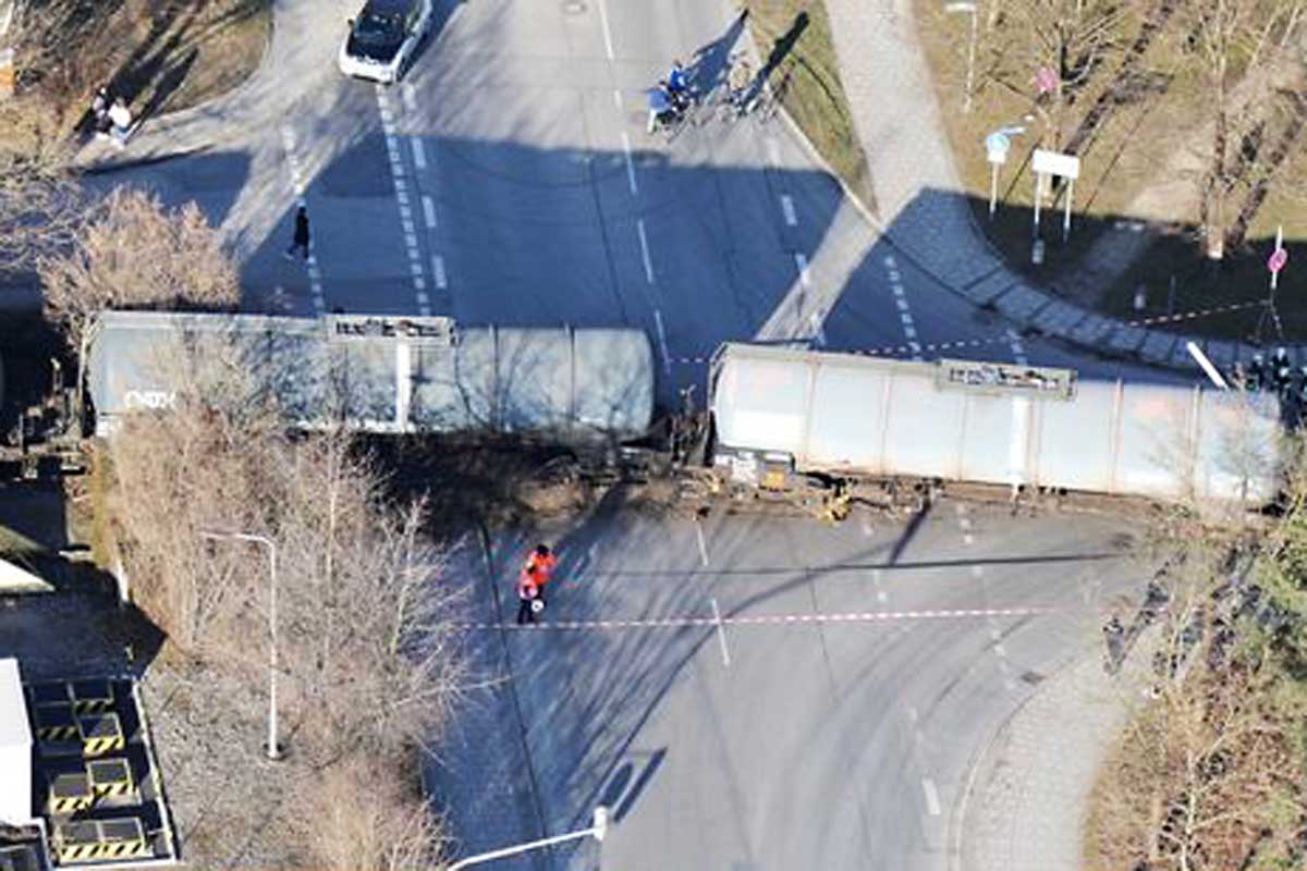 Ein am Mittwochnachmittag (24. März) auf DB-Gelände rangierender Güterzug geriet aus noch unbekannten Gründen auf ein Gleis eines Firmengeländes in Feldkirchen, Lkr. München, und schob dort zwei leere Kesselwagen auf eine angrenzende Straße.