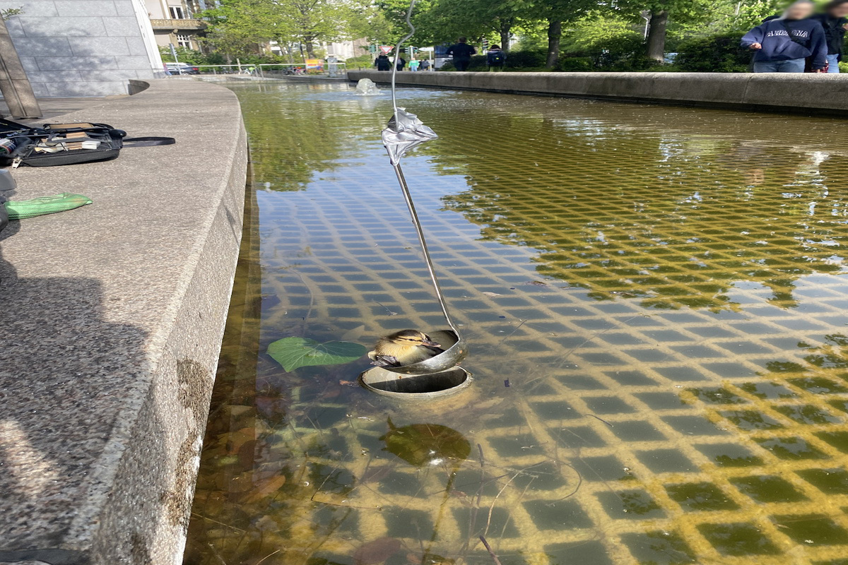 Am Donnerstagnachmittag (27.04.2023) gegen 17 Uhr wurden der Feuerwehr zwölf tierische Kleinkinder, welche in einem Überlaufrohr eines Beckens für Wasserspiele in der Bockenheimer Landstraße feststeckten, gemeldet. Jedoch fehlte nach erster Erkundung das passende Gerät für eine "technische" Rettung.