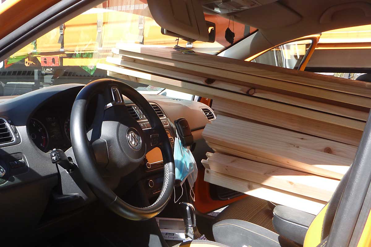 Da die Dielen viel zu lang für den Pkw waren, ragten sie nicht nur aus dem Kofferraum raus sondern waren auch auf dem Armaturenbrett vor der Windschutzscheibe abgelegt. Gesichert war das ganze Bündel Dielen nur mit einem Gummiexpander.