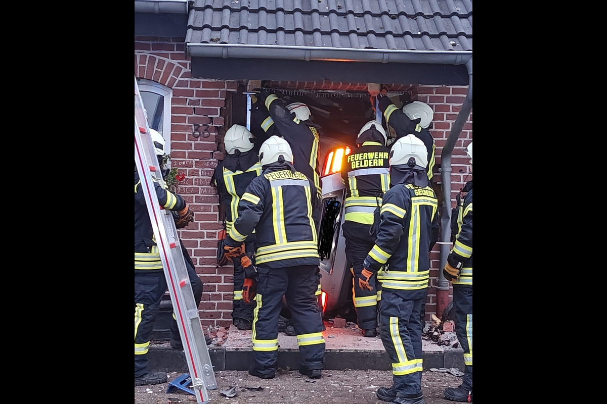 Schwerer Verkehrsunfall in Geldern-Pont: Am Samstagnachmittag (20.12.2025) verlor ein 22-jähriger Autofahrer aus bislang ungeklärter Ursache die Kontrolle über seinen Wagen und krachte in ein Wohnhaus.