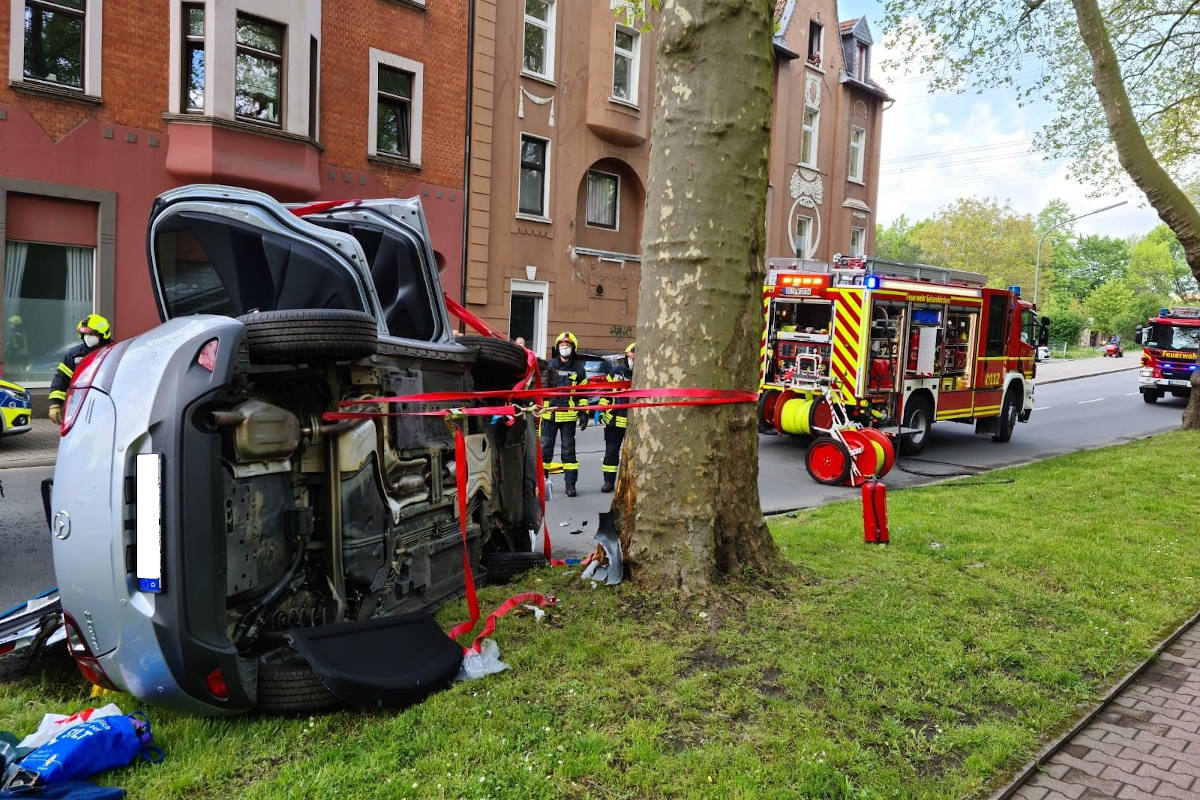 Im Kreuzungsbereich Schwarzmühlenstraße / Hördeweg kollidierten gegen 12:45 Uhr die beiden Fahrzeuge. Ein Auto kam dabei von der Fahrbahn ab, prallte gegen einen Baum und blieb auf der Fahrerseite liegen. Unter dem Einsatzstichwort "TH Person eingeklemmt" rückten Kräfte der Wache Altstadt, Heßler und Buer aus. Sie fanden den verunfallten Mazda auf der Seite liegend vor. Im Fahrzeuginneren befand sich noch die verletzte Fahrerin. Während das Rettungsdienstpersonal die Frau betreute, stabilisierten die weiteren Einsatzkräfte den Pkw.