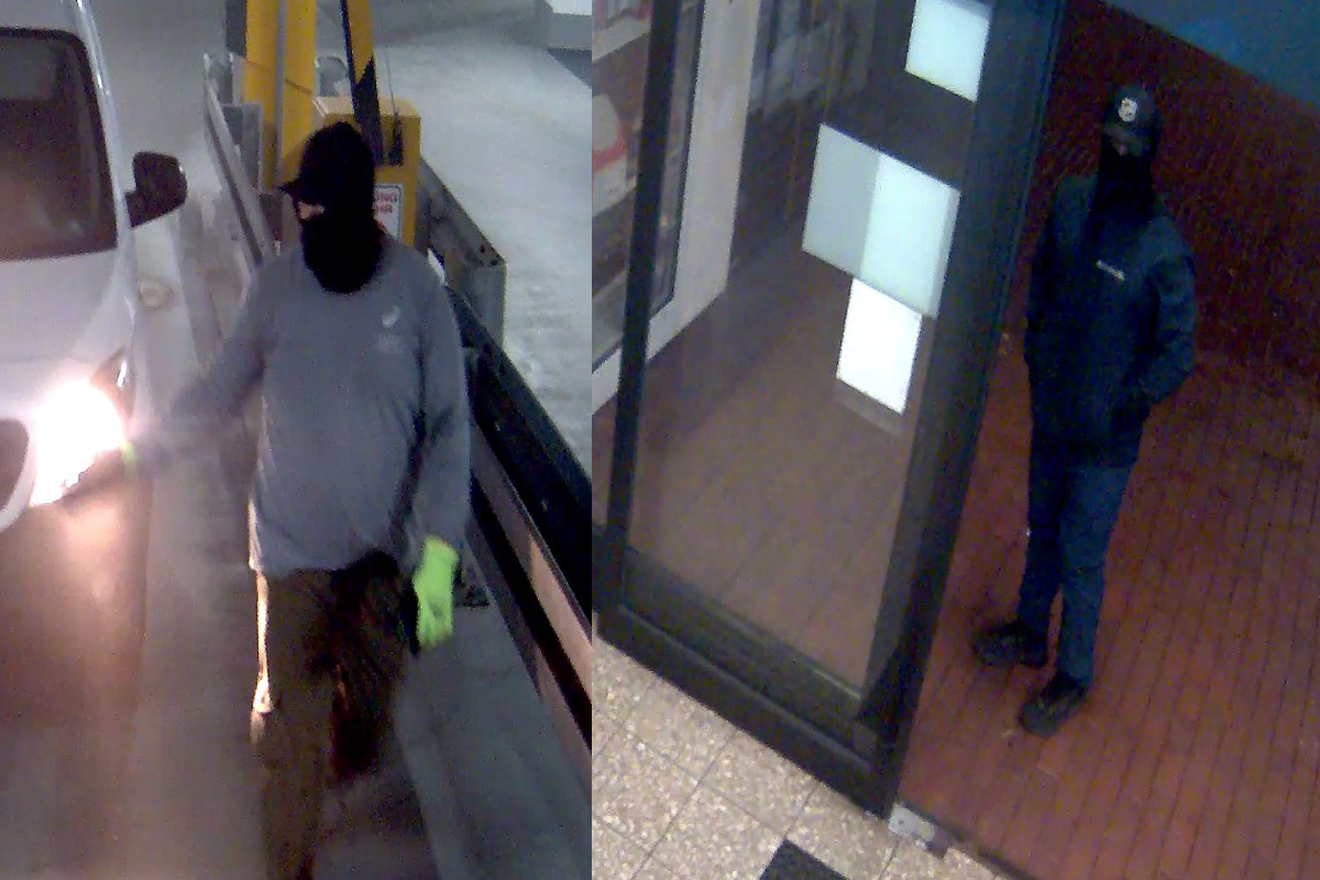 Die Aufnahmen stammen aus einem Parkhaus, über das die Täter in das angrenzende Bankgebäude eingedrungen sind. Die Fotos, die alle am 29.12.2025 entstanden, zeigen drei maskierte Männer sowie zwei Fahrzeuge.
