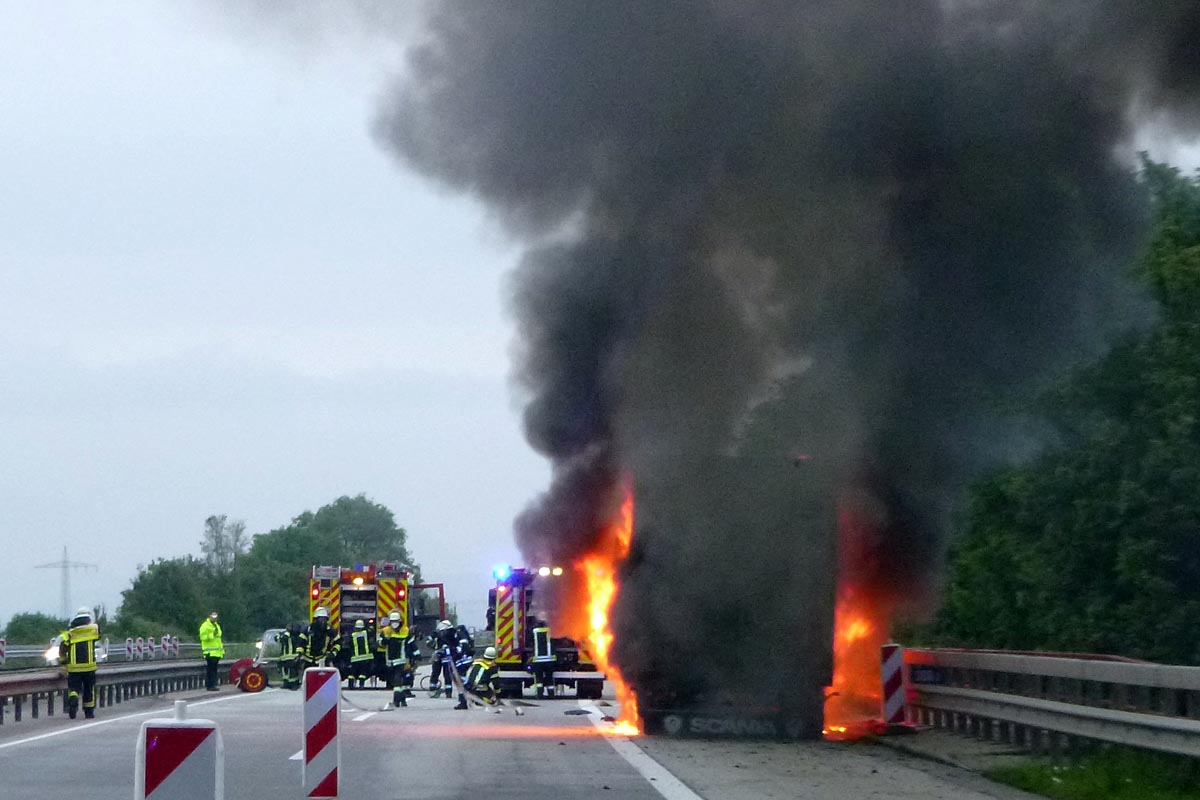 Der 27-jährige Fahrer des LKW aus Italien blieb unverletzt. Die Polizei geht an Auflieger und Ladung von einem Totalschaden und einem technischen Defekt für die Entstehung des Brandes aus.